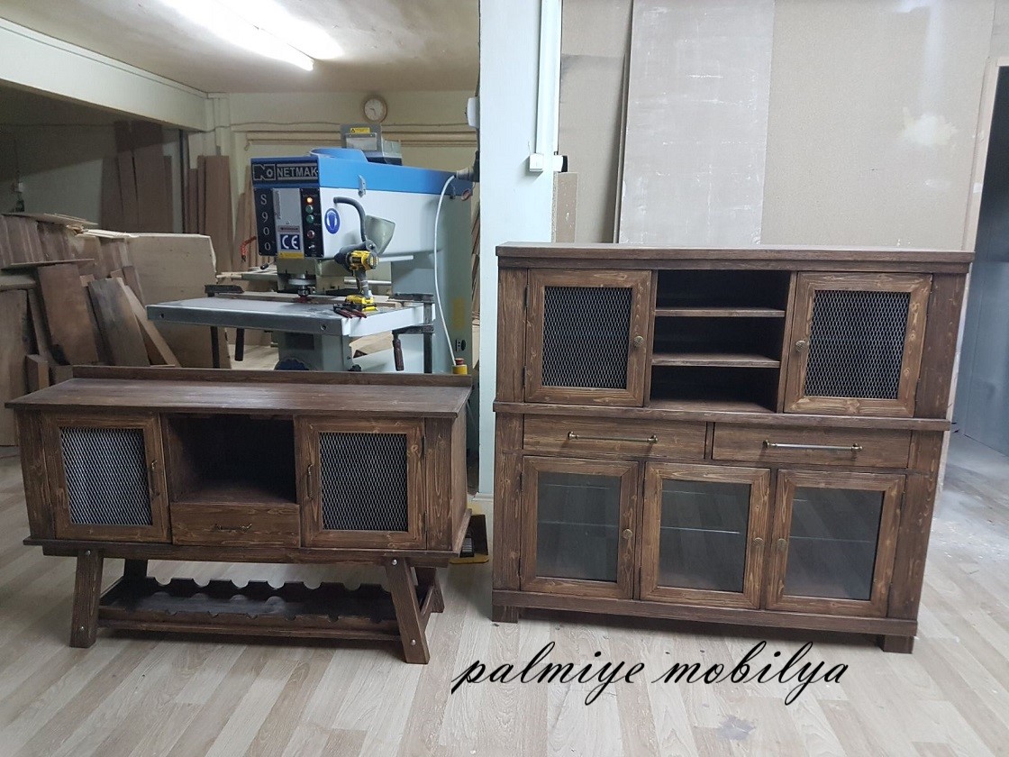 Salon: Ahşap TV üniteleri, sehpalar, vitrinler ve konsollar.